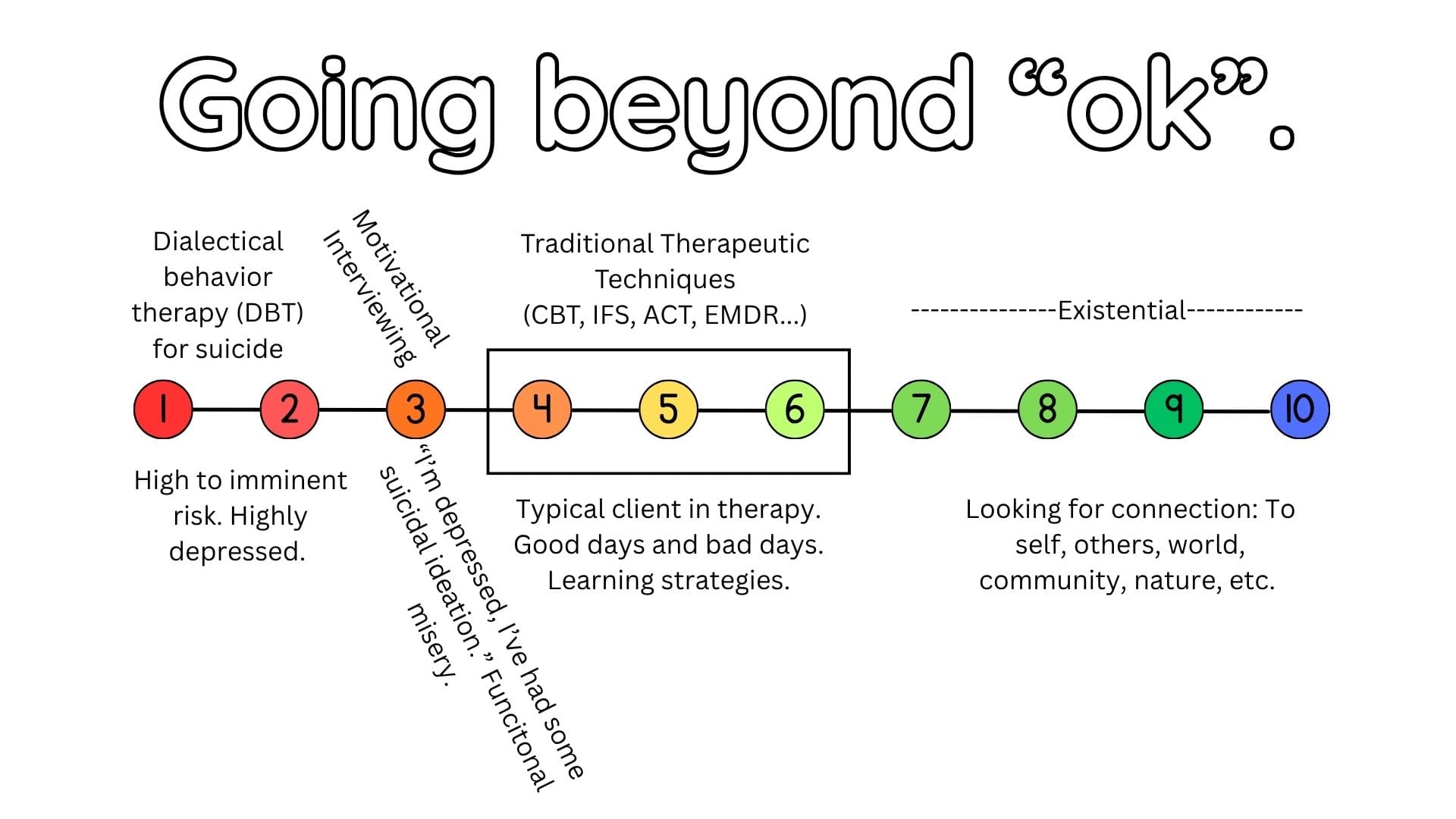 We work with clients along the wide spectrum of psychological progress, and create a supportive environment grounded in therapy to help you move through your life journey towards finding true connection in your life, love, family, and community. We help you go beyond OK.